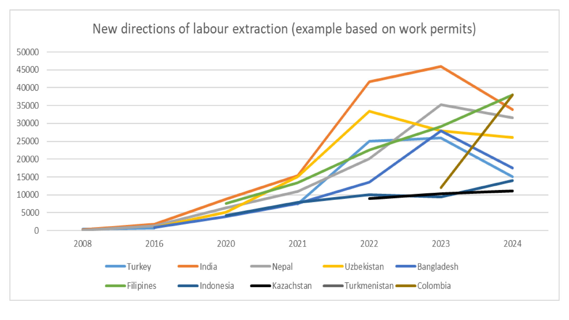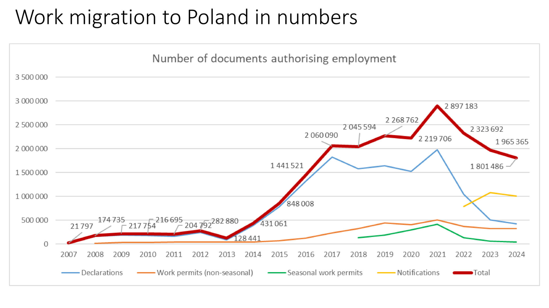 Przez co najmniej dwie dekady po „transformacji ustrojowej” w 1989 r., Polska określana była jako kraj emigracji, a nie imigracji. Proces ten i związane z nim postrzeganie Polski przyspieszyły wraz z przystąpieniem kraju do UE w 2004 r. i stopniowym znoszeniem barier wjazdowych dla polskich pracowników przez państwa członkowskie UE w latach 2004-2007. W tym samym czasie, już od początku lat 90-tych, Polska stanowiła również kraj docelowy migracji dla osób z Ukrainy i Białorusi znajdujących zatrudnienie w budownictwie, rolnictwie i pracy domowej. Punktem zwrotnym na tym polu był rok 2006, kiedy Polska wprowadziła uproszczoną procedurę zatrudniania cudzoziemców w rolnictwie i rozszerzyła ją na inne sektory rynku pracy w następnym roku. Jednak dopiero w 2015 r. imigracja przewyższyła emigrację. Obywatelki i obywatele Ukrainy i Białorusi pozostają najliczniejsi wśród pracowników cudzoziemskich w Polsce, jednak w ostatnich latach odnotowano wzrost liczby zezwoleń na pracę wydawanych obywatelom i obywatelkom krajów Azji i Bliskiego Wschodu, takich jak Filipiny, Indie, Uzbekistan i Turcja, a także krajów Ameryki Łacińskiej (patrz wykres).